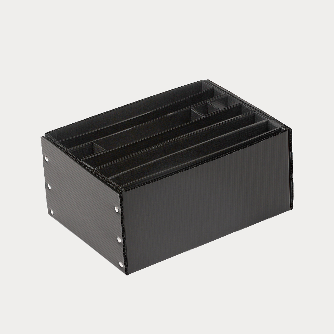 同様に仕切り、トレー、緩衝材も導電性のものがあり、併用することで運搬時にも安心してご使用いただけます。