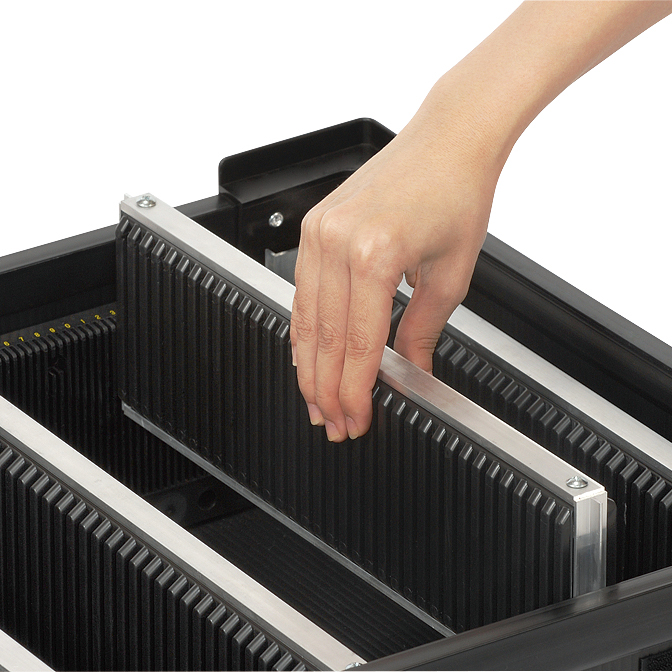 溝板(サイドガイド)を箱に固定せず導電性ダンプラシートに取り付けるため、箱からの取り出しが可能です。